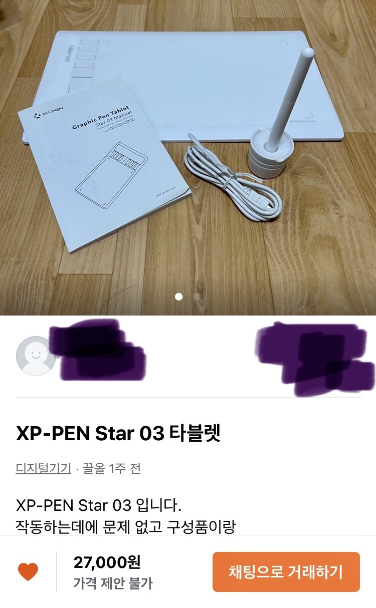 뭔가 컴퓨터를 좀 더 다양하게 사용하려면 좋은 타블렛이나 태블렛, 혹은 아이패드나 등등 많이 필요하겠지만 나는 일단 많은 사람들이 사용하는 타블렛을 처음쓰는 거라, 저렴이를 찾다가 당근마켓을 사용하게 되었다. 정말 물품이 굉장히 많았고, XP-PEN Star 03는 일본 제품으로 좀 오래된 모델이긴 하나, 사용하는데에는 별 문제가 없고, 현재 맥북도 버젼이 낮은 거라 연동이 되려면 오래된 기종이 필요했다. 원래 가격은 10만원 이내, 구입은 2만7천원, 4년 전에 구입했지만 흰색은 보기 드물고 게다가 매우 저렴하게 내놓아서 보자마자 바로 채팅으로 구매를 하고 싶다고 알렸다.