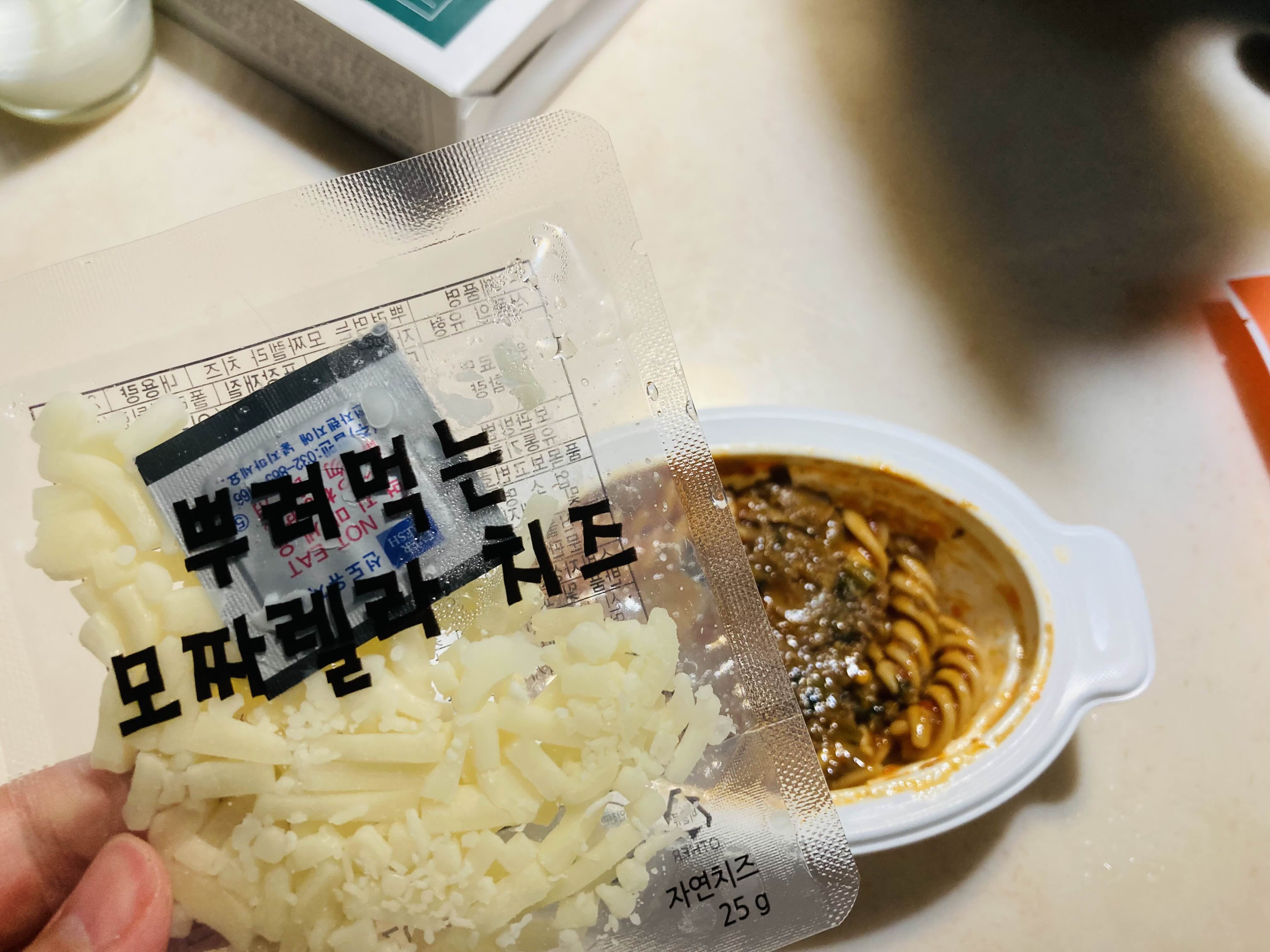 비닐개봉 후 - 모짜렐라 치즈를 뿌리고 - 전자렌지에 2분 데워준다.