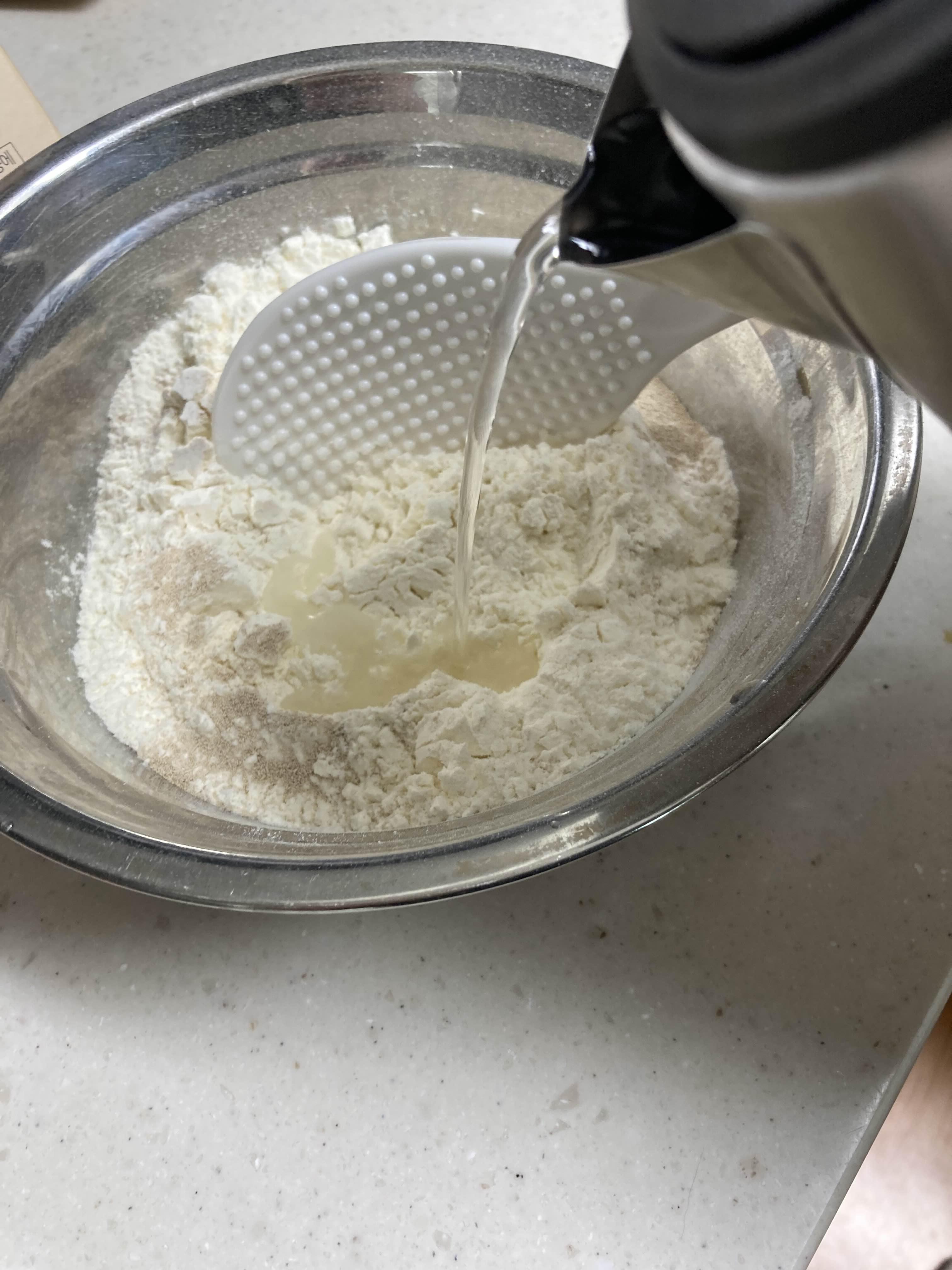 이스트가 없는 부분으로 따뜻한 물(뜨거운 물 X)을 조금씩 부어주고 저어준다.
