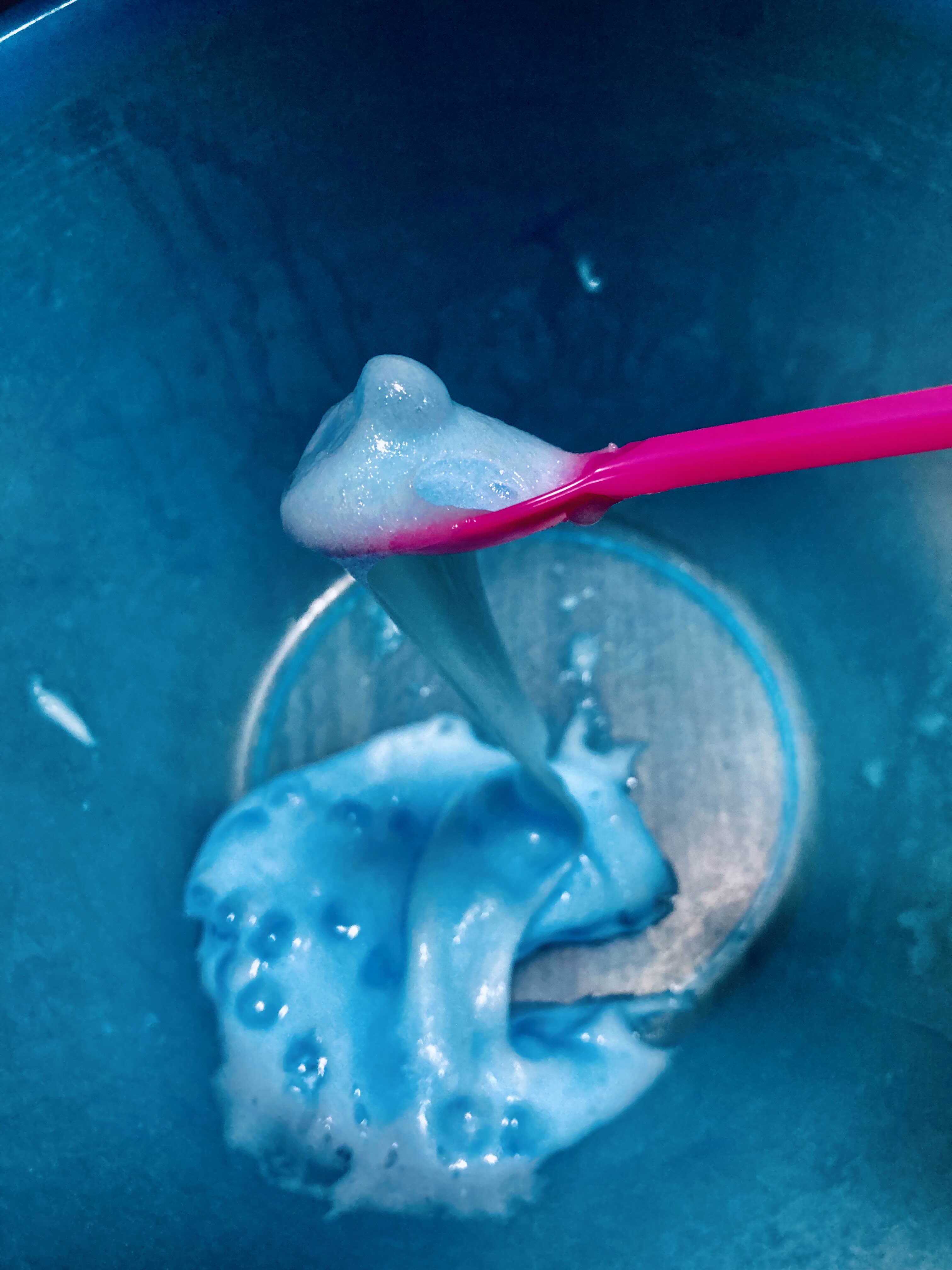 못쓰는 플라스틱 그릇에 담아 계속 플라스틱 수저로 저어주었다