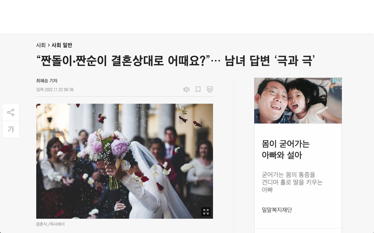 요즘은 확실히 결혼 기피 현상을 어디에서나 들을 수가 있다. 대부분 예능의 영향, 이를테면 결혼 전과 후의 모습이 적나라하게 묘사되는 흥행보증수표나 다름없는 부부 예능들을 몇 년 동안 보면서 다들 느꼈을 것이다. 아니, 그렇게 사랑해서 결혼했는데 라는 수식어가 따라오면서 역시나 결혼 후는 변한다. 육아는 정말 힘들다. 이걸 계속해서 몇 년 동안 예능에서 봤단 말이다. 그러면서 결혼을 해라, 뭐 좋다 이런 식으로 또 바꿔서 역으로 선전하는 것은 이미 젊은 사람들의 정신에 결혼은 장난이 아니라는 것을 때려 박은 어른들에 대한 부작용이나 다름이 없는 것이다. 영화가 사랑에 대한 혹은 연애에 대한 모든 것을 망쳐놓는 것과 같이 예능은 결혼관을 완전히 바꿔놓았다. 물론 100퍼센트 예능 때문은 아니지만, 어쩄든가 우리가 가장 많이 봤던 그 우블리라는 중국출신 배우와 한국 출신 배우가 결혼해서 그렇게 부인을 위하면서 방송에서 나왔을 땐 언제고 바람을 피워서 여러 번이나 목격되는 그런 이슈 등에 이미 우리는 결혼에 대한 불안감을 정면으로 깨닫게 되는 순간이었다.