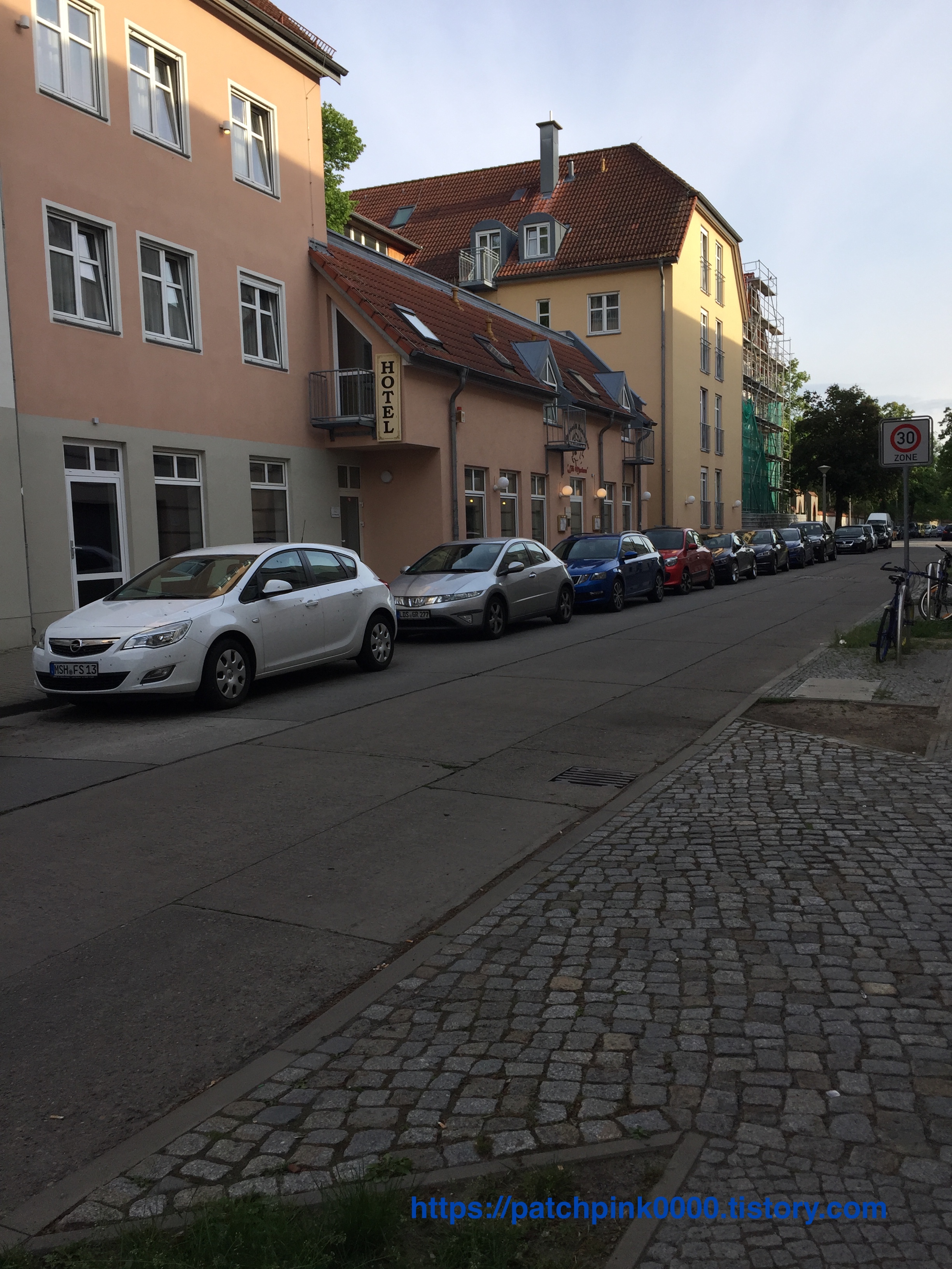 버스에서 내리자 마자 좀 걸어서 호텔에 도착했습니다. 한국에서 호텔과 독일에서의 호텔의 분위기는 사뭇 다릅니다. 독일은 좀 건물들이 모던한 것보다 소박한 것들이 많은 것 같아요. 물론 잘사는 뮌헨이나 더 큰 도시들은 아주 큰 호텔들이 많겠지만요. 여기 소도시 포츠담 입니다. 한 5분정도 걸어가면 바로 보입니다.