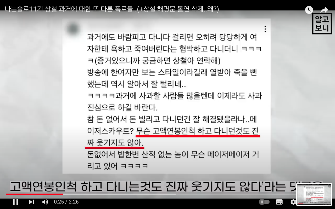 그의 최근 사과문에서도 착한 척 하면서 타인을 까내려 가는 타인을 집착하는 여자 그리고 언어폭력을 쓰는 여자로 오해하게 만들었는데, 이게 아 다르고 어 다른 얘기인데도 불구하고, 말을 저렇게 까내려서 하는 남자, 피해야 한다. 철저하게 자기중심적인 사고를 가진 사람이다.