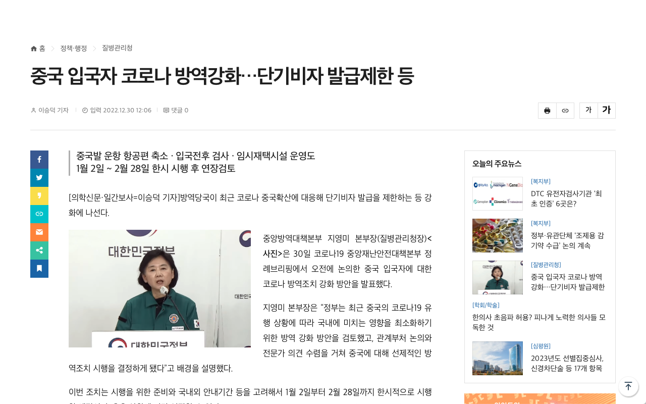 안녕하십니까? 질병관리청장입니다. 12월 30일 중대본 정례브리핑을 시작하겠습니다. 오늘 중대본에서 논의한 중국 입국자에 대한 코로나19 방역조치 강화 방안에 대해 말씀드리겠습니다. 정부