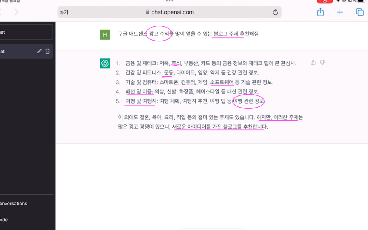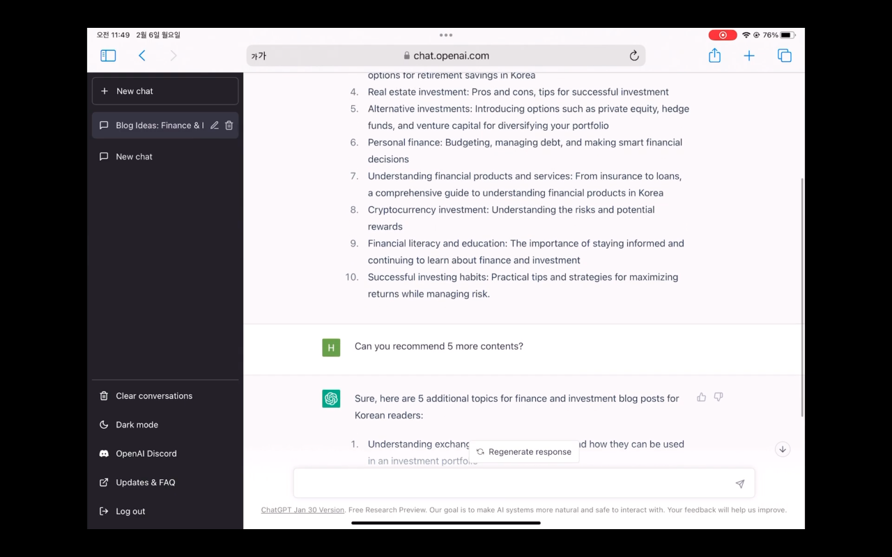 - 한국인 독자들을 위한 금융과 투자에 대한 포스팅 주제를 추천해 달라고 했더니 10가지나 추천을 해줍니다.