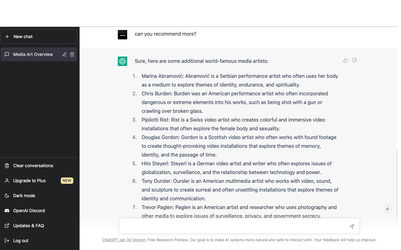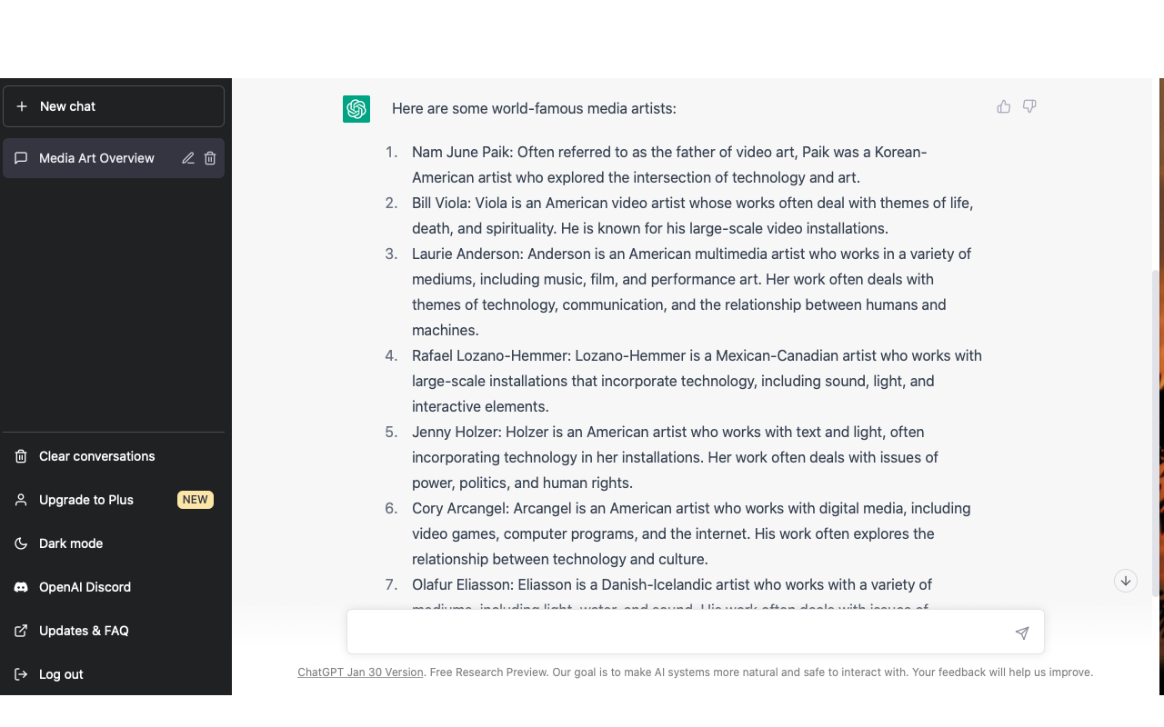 세계적으로 유명한 미디어 아티스트를 알려달라고 했습니다.