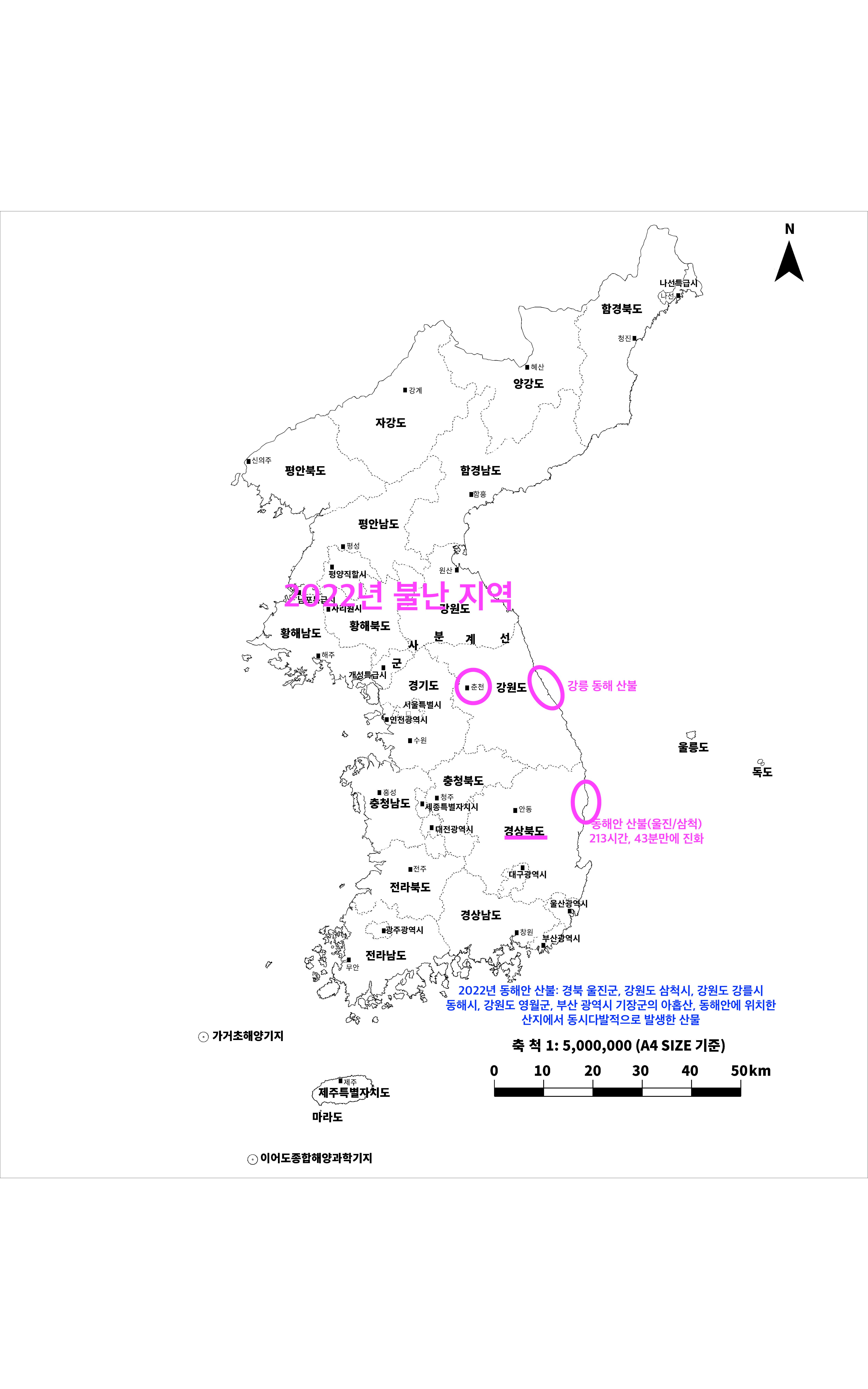 이 기간 중 지난 5일 경북 봉화에서, 지난 10일에는 강원 양구와 경북 군위에서 각각 100ha가 넘는 대형산불(영덕, 합천·고령, 울진·삼척, 영월, 강릉·동해, 봉화, 양구, 군위)이 발생하기도 했다.