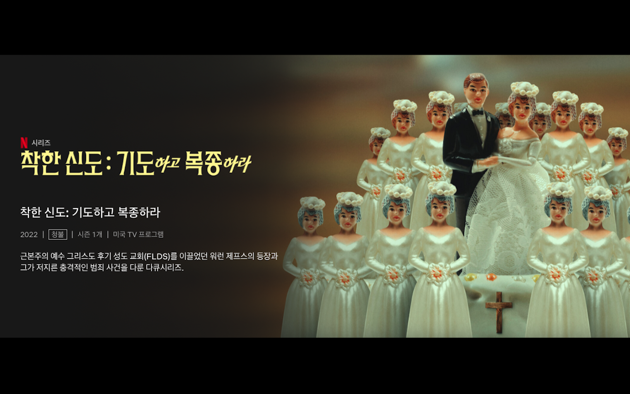 요즘 사이비 종교 문제로 전세계를 들썩이고 있기도 합니다. 각종 언론에서 알려주는 사이비에 빠지는 요인들이나 여러 형태들을 분석하고 왜 사람들이 빠지는지에 대해서도 계속해서 언급하고 있기도 하죠 저도 이리저리 찾아보다가 마침 넷플릭스에도 사이비 종교를 다루는 다큐멘터리가 있어서 한번 보게되었는데, 이 영화는 1929년 주류 몰몬교에 대해 다룬 이야기였습니다. 몰몬교 중에도 "근본주의" 분파라며 일부다처제를 시행하고 한 도시에서 자신들만의 왕국을 만들어 은둔생황을 하는 것으로 알려져 충격을 주고 있었습니다. 이들은 사이비 종교이자 범죄 조직으로 분류되고 있습니다. 이유는 미성년자(심지어 14세)와 결혼을 하고 일부다처제를 시행하는 데 그것이 2,3사람이 아닌 수십명의 부인을 거느리고 수십명의 아이들을 출산하기 때문입니다. 몰몬교에서 남자는 부인이 많을 수록 더 높은 곳에 오를수 있다고 생각하는 집단이기 때문이죠. 심지어 친척과 결혼을 강요하기도 합니다.