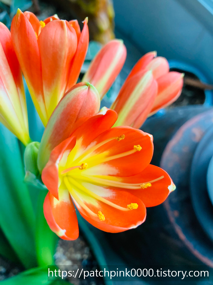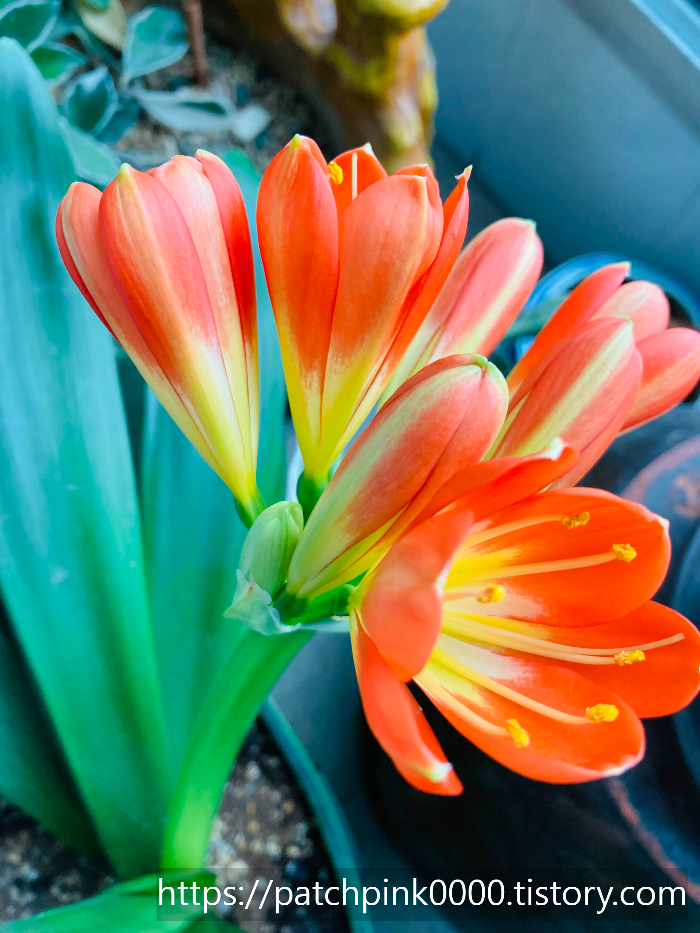 군자란의 꽃의 색상은 진하고 밝은 주황색과 노란색이 함께 있습니다.