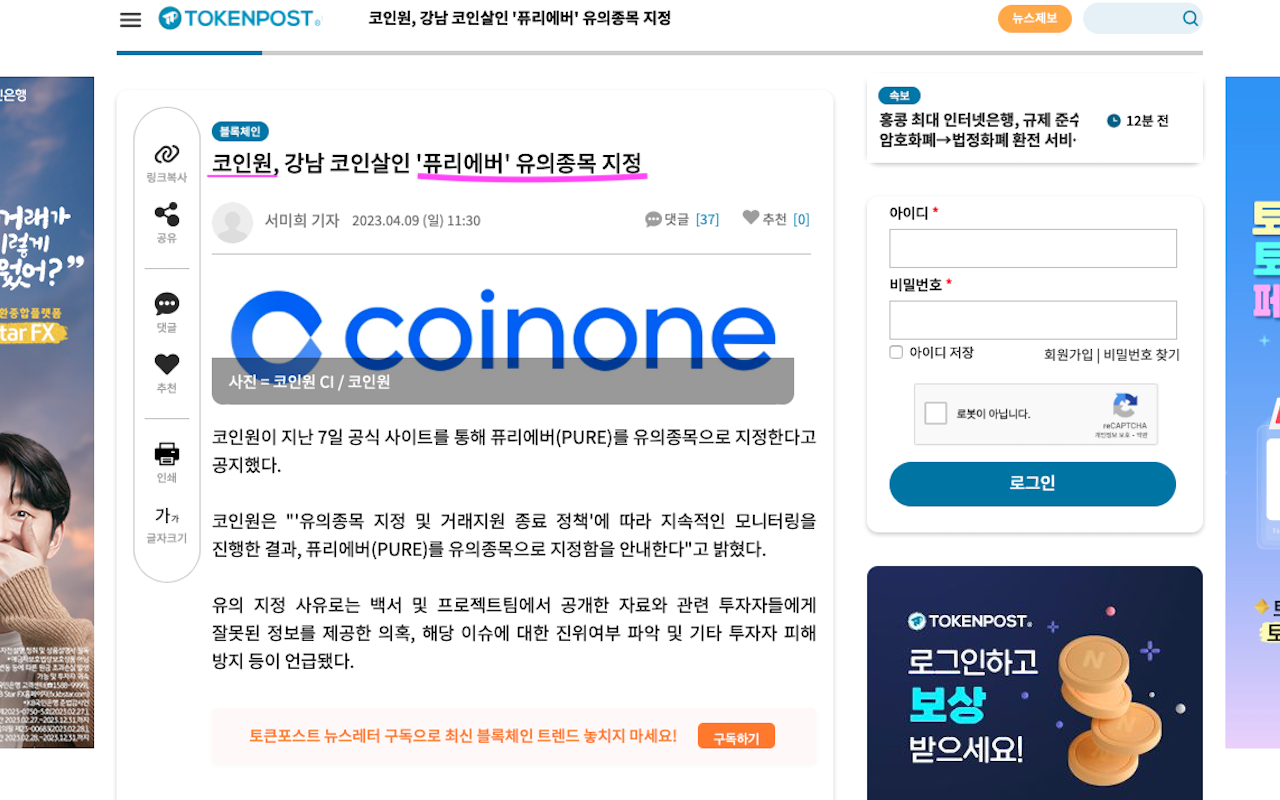 - (부부사기단, 남편)KT마케팅본부 영업사원 출신이라는 이모씨가 2019년 설립한 퓨리에버 코인이 있기전에 바인빗으로 사람들을 먼저 시험해보고 그게 되자, 2014년 설립한 이모씨의 회사는 2019년 그 다음 퓨리에버 코인을 발행을 추진하고, 이 코인이 2020년 11월 13일 거래소 코인원에 상장되었다. (서울 남부지검의 별도 검사 과정에서, 상장 과정에서 상장 브로커에게 수천만원의 뒷돈을 거래했다는 것이 밝혀졌다)(출처, 경향신문)