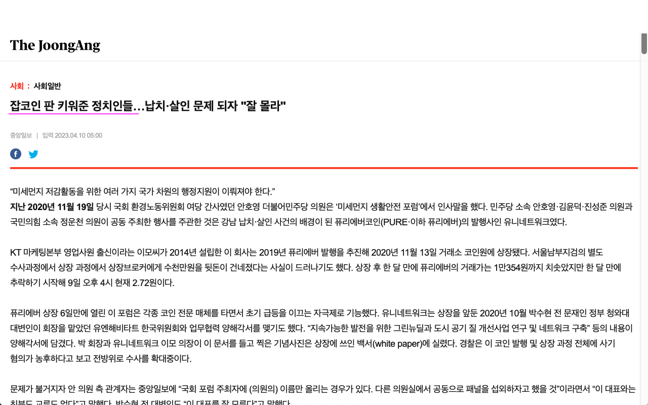 - 2020년 11월 19일 당시 국회 환경노동위원회 여당 간사였던 안호영 더불어민주당 의원은 이 코인의 해당 회사와 함께 퓨리에버를 설립한 유니네트워크 공동 행사에서 "미세먼지 생활안전 포럼"에서 인사말을 했고, 그외 민주당 소속 안호영, 김윤덕, 진성준 의원과 국민의힘 소속 정운천 의원이 참여했다고 알려졌습니다. 국회의원까지 나와서 축사를 하니 투자자들은 실제로 그게 진짜 인 줄 알고 부부사기단에 넘어가 부부 사기단은 이 일로 코인 투자금액을 100억대 까지 얻게됩니다. (출처 및 자료, 경향신문, 가세연, 중앙일보)