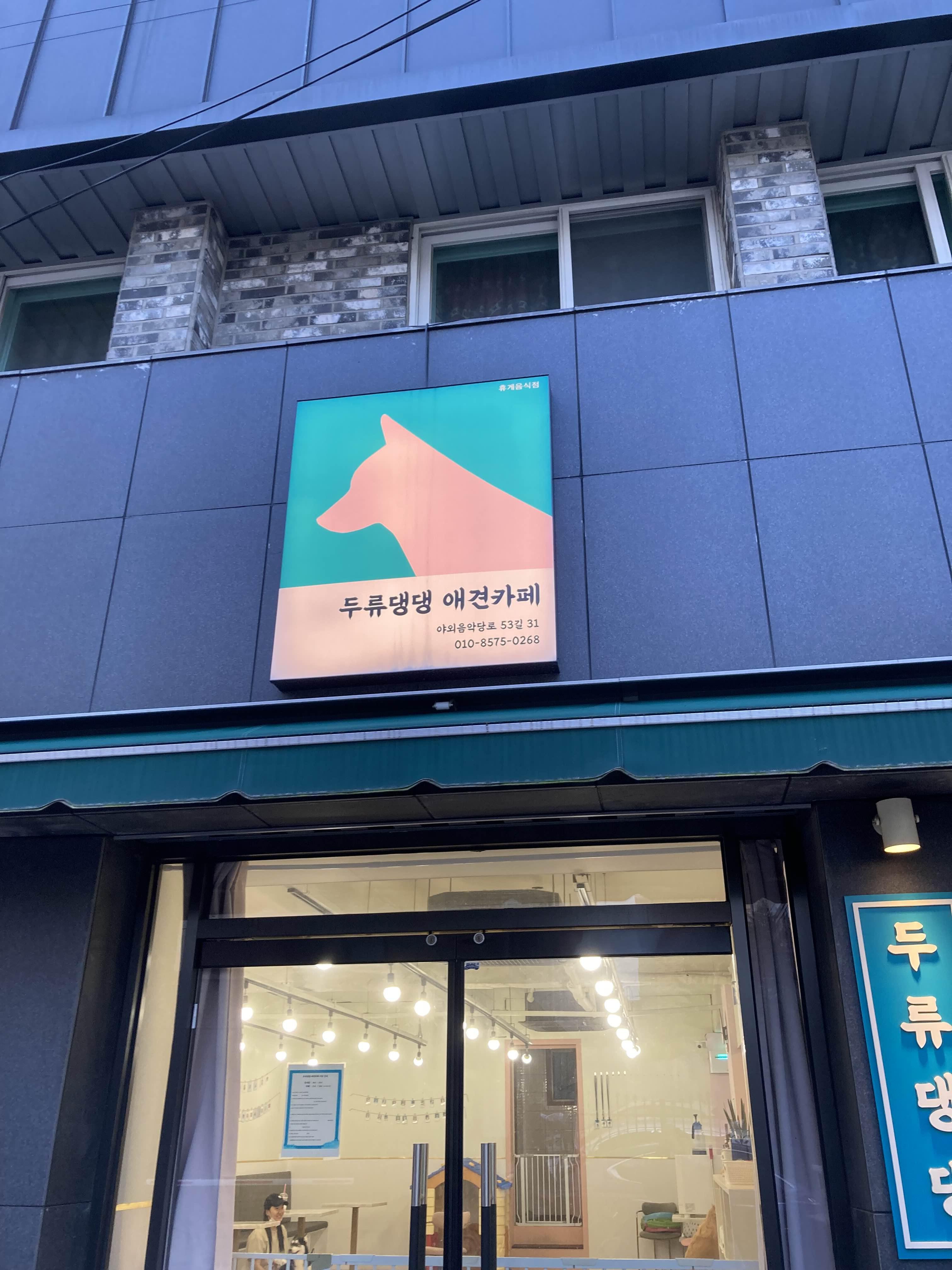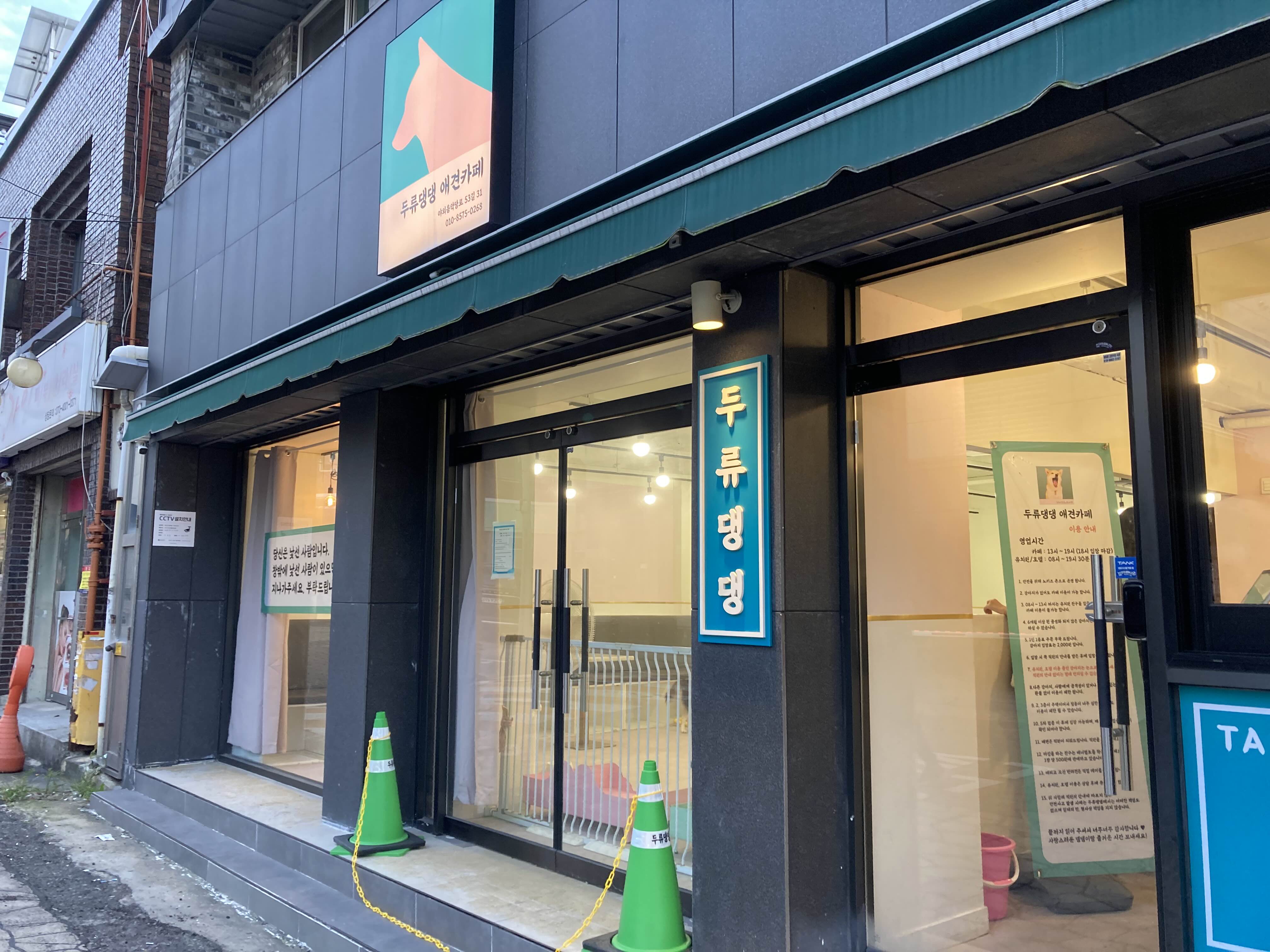 이월드 근처 골목 상가들에 위치한 두류댕댕이라는 강아지 카페의 전경입니다.