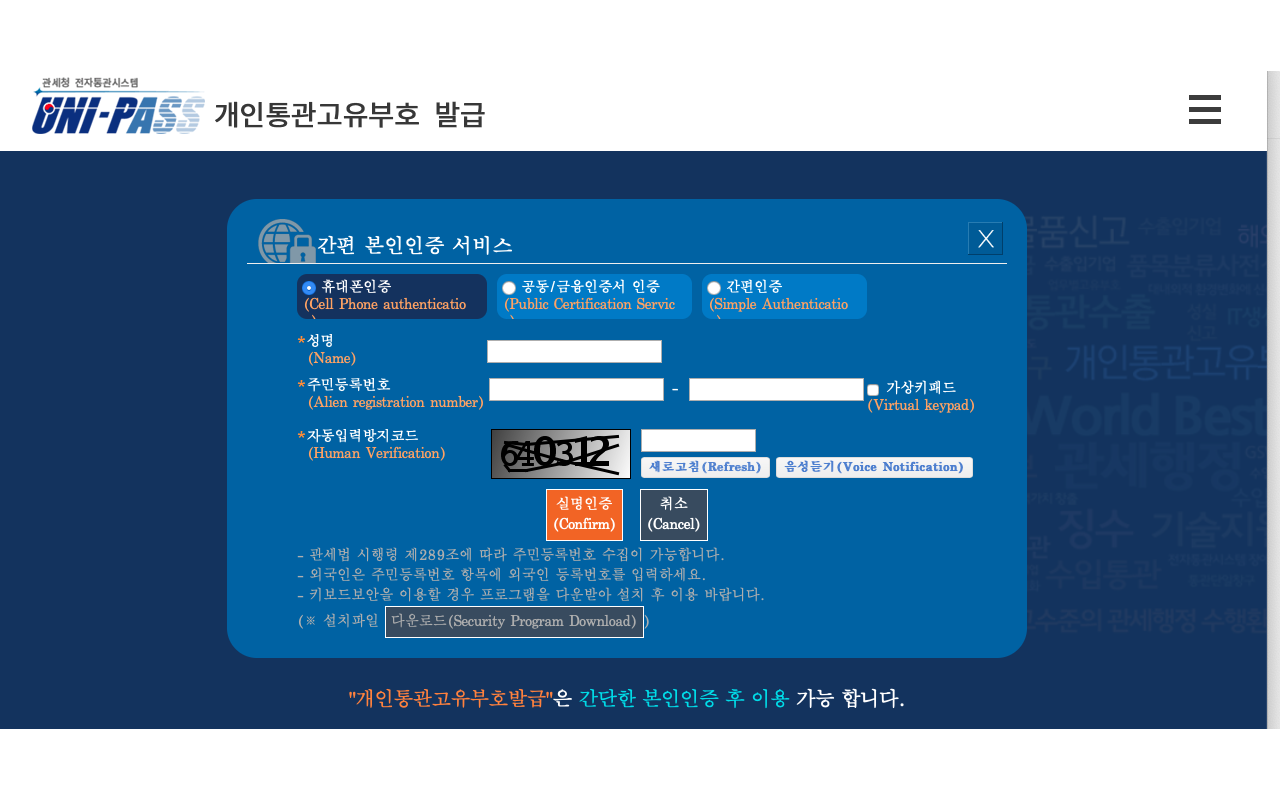 "개인통관고유부호발급"은 간단한 본인인증 후 이용 가능 합니다.