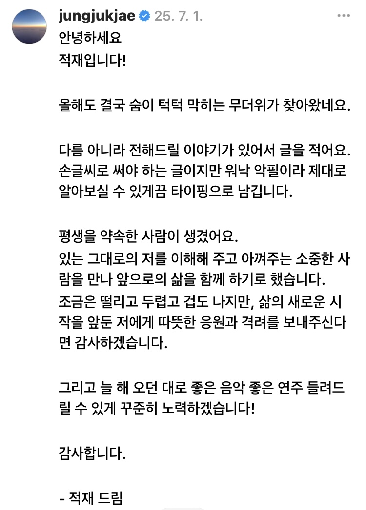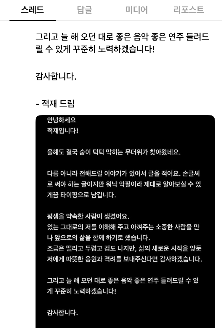 최근에 SNS 스레드를 보다가, 갑자기 적재님이 결혼 발표를 해서 깜짝 놀란 팬들이 많을 것이다