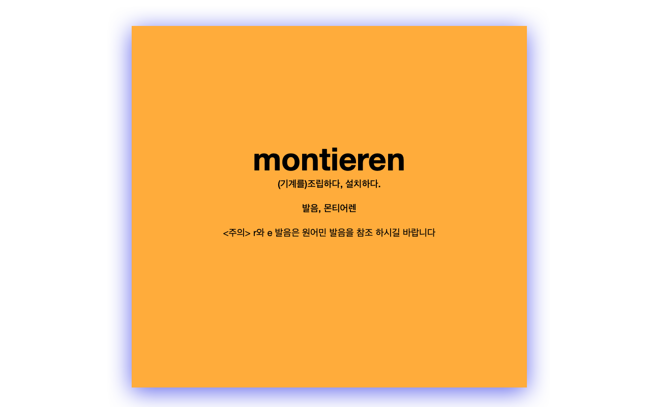 3. montieren(타동사, 발음, 몬티어렌) : (기계를) 조립하다, 설치하다.