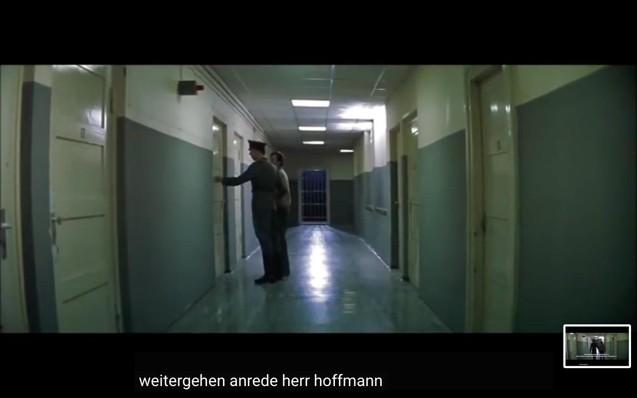 Häftling 227 sieht schon ganz anders aus als zu Beginn des Verhörs. Er ist bleich und hat trockene Lippen. Er kann sich kaum noch auf seinem Hocker halten, so daß ihn der Wächter an den Schultern stützen muß. Hinter dem Tisch sitzt ein Vernehmungsoffizier. Als Wiesler hereinkommt, erhebt er sich und geht hinaus, an Wiesler vorbei, der ihm den Schlüssel zum Ruheraum übergibt. (Das Surren des Vorspulens hört auf. Man hört das Klicken einer Wiedergabe Taste).