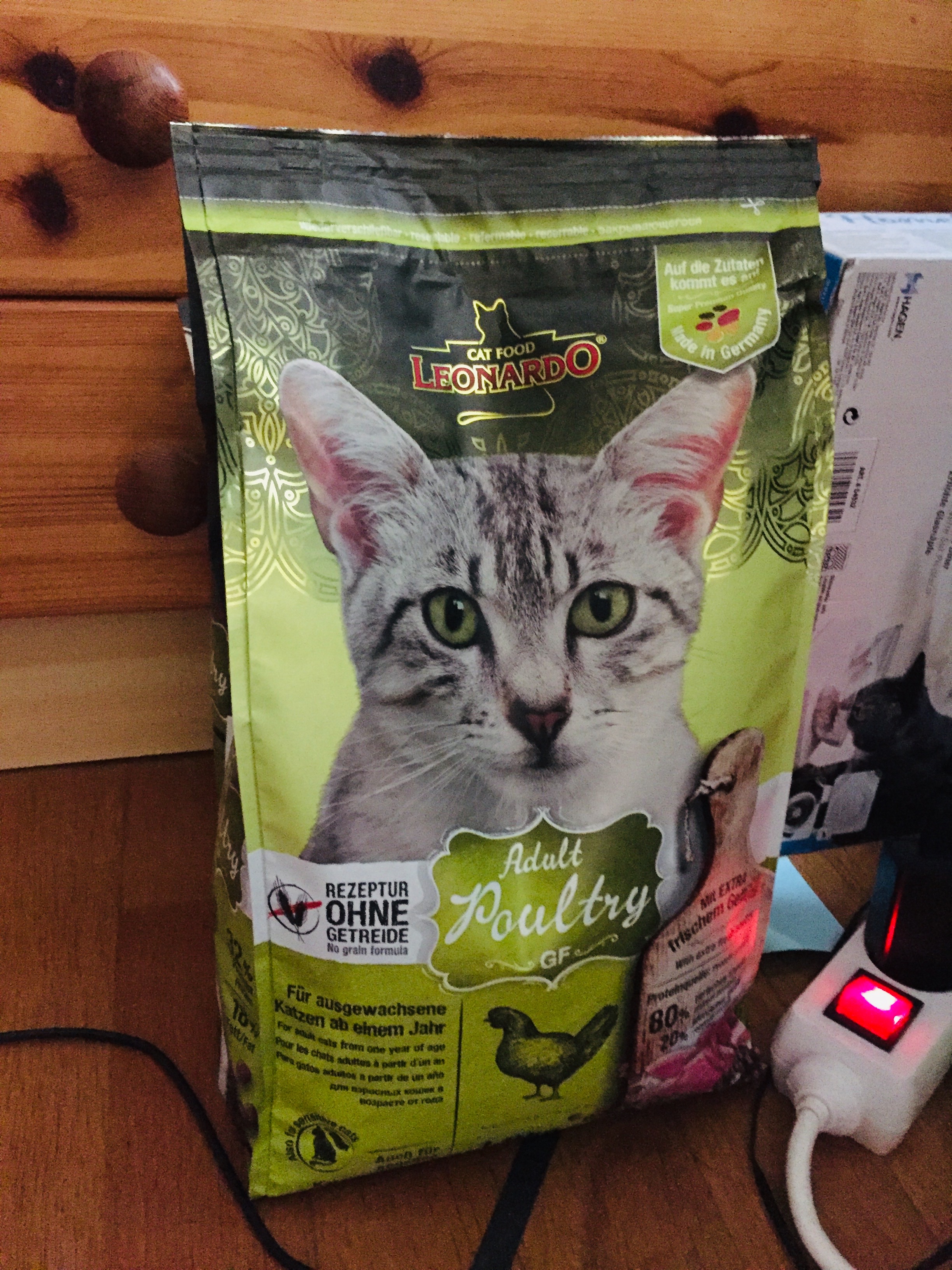 이전에 로얄캐닌을 먹었었는데, 먹고 좀 이상한 반응들이 가끔 나타나서 헤어볼도 자주 하는 바람에 뭔가 잘못된 것 같아서 털도 많이 빗어줬는데도 자주 헤어볼을 뱉는 현상이 계속 나타났죠. 그리고 가끔 음식을 토하기도 해서 바로 사료를 바꿨습니다. 그리고 알아보니 로얄캐닌이 이전에 문제가 있었던 사료라 독일에서 지내는 한국분 캣맘 캣파더 커뮤니티에서 알려주셔서 사료를 바꿨는데 저 레오나르도 사료가 너무 좋아서 2년째 계속 사용중에 있습니다. 밍키가 넘 좋아하고, 문제는 넘 좋아한다는 거에요.하하, 저 양이면 한달정도 충분합니다. 가격은 18유로. 2만3천원 정도.