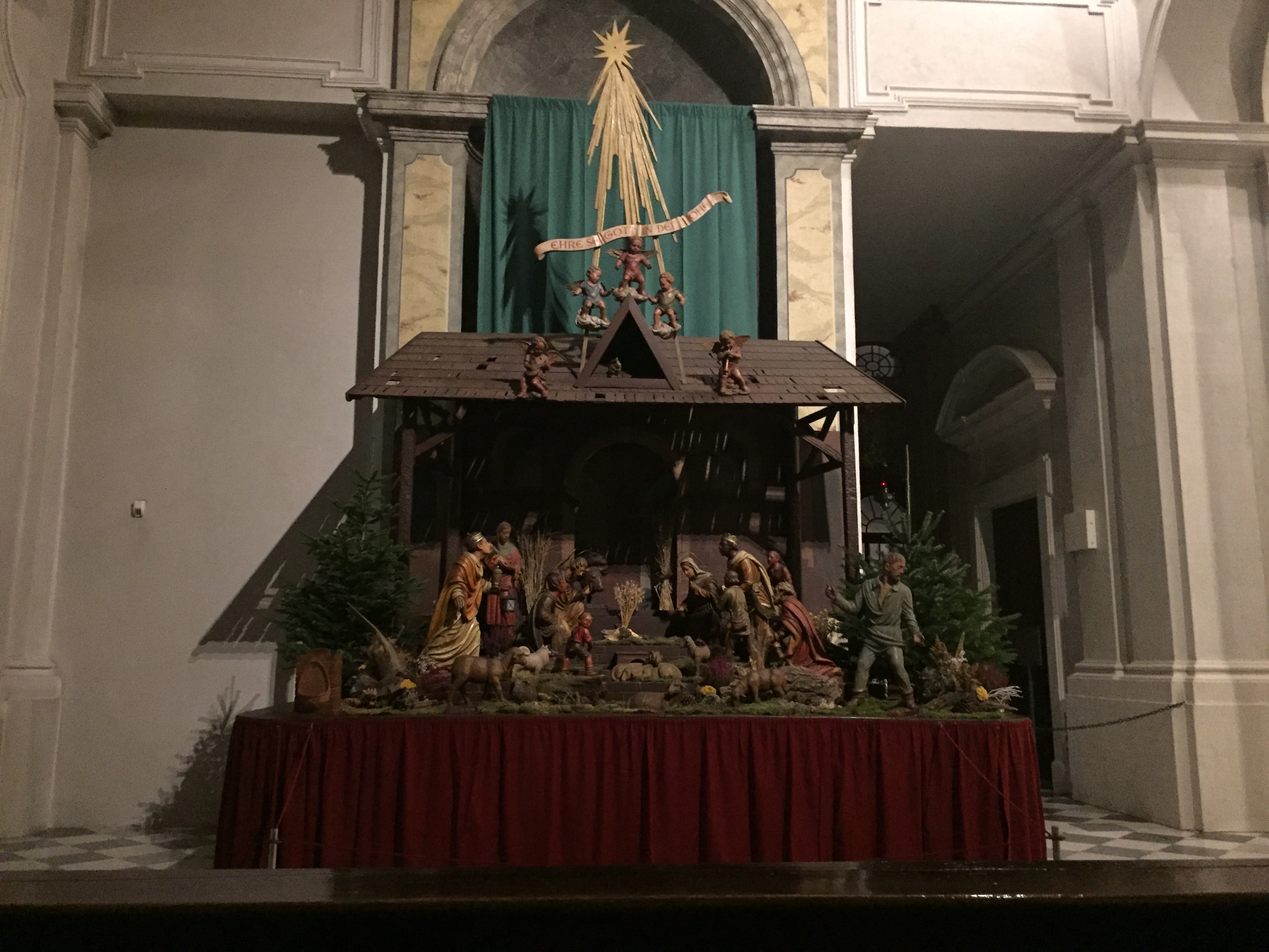 성당안에 들어가서, 아기 예수님의 탄생을 나타낸 조형물을 찰칵!