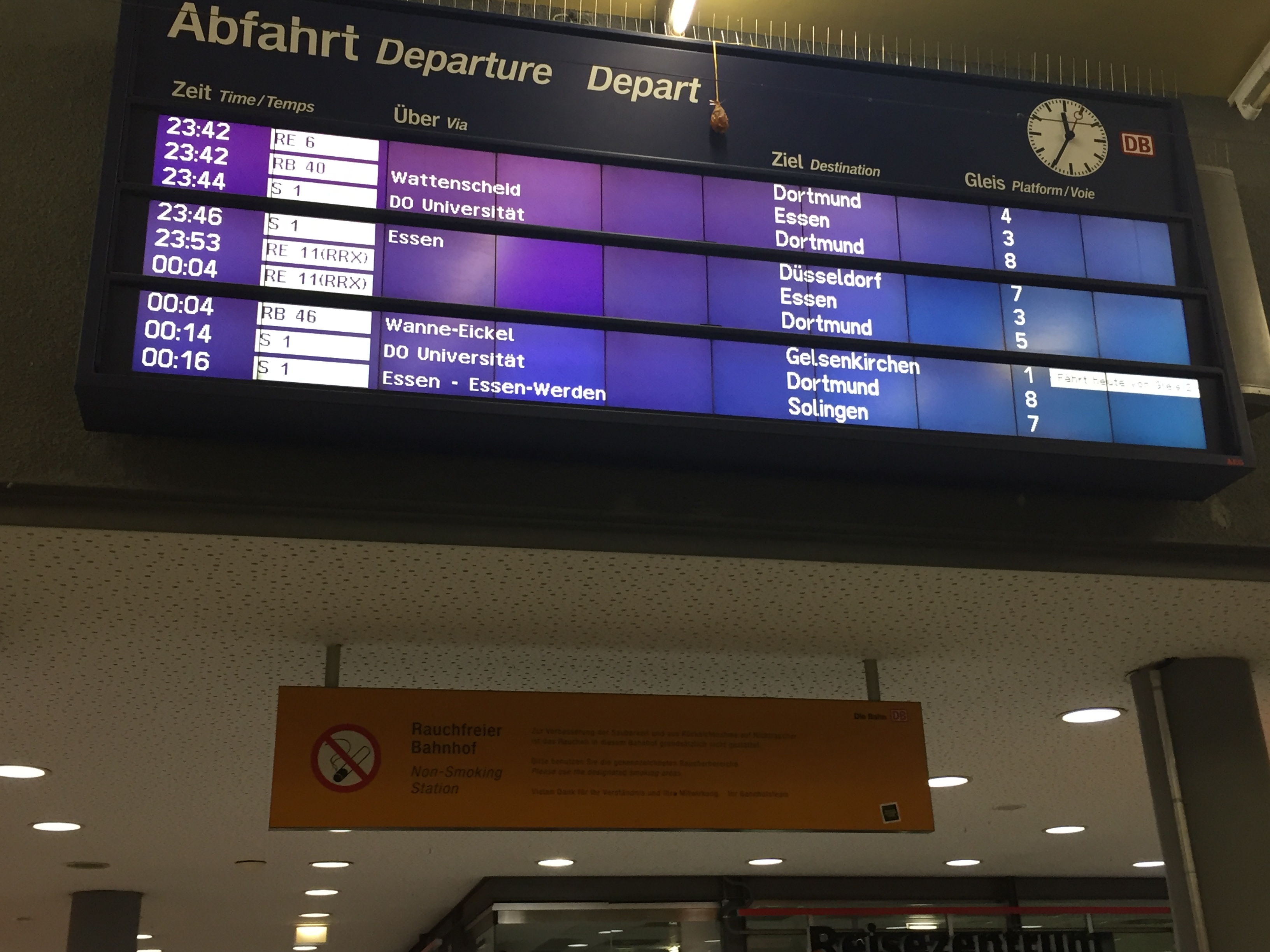 나는 드레스덴에서 라이프치히에서 갈아타고 에센에서 내려서, 다시 보훔가는 기차를 타고 보훔에서 구경을 조금 하고나서 다시 기차를 타고 에센으로 왔다. 예전에 서독에 살던 기억이 있어서 뭐 근처 도시를 돌아다니는 데에는 빠삭해서 괜찮다.