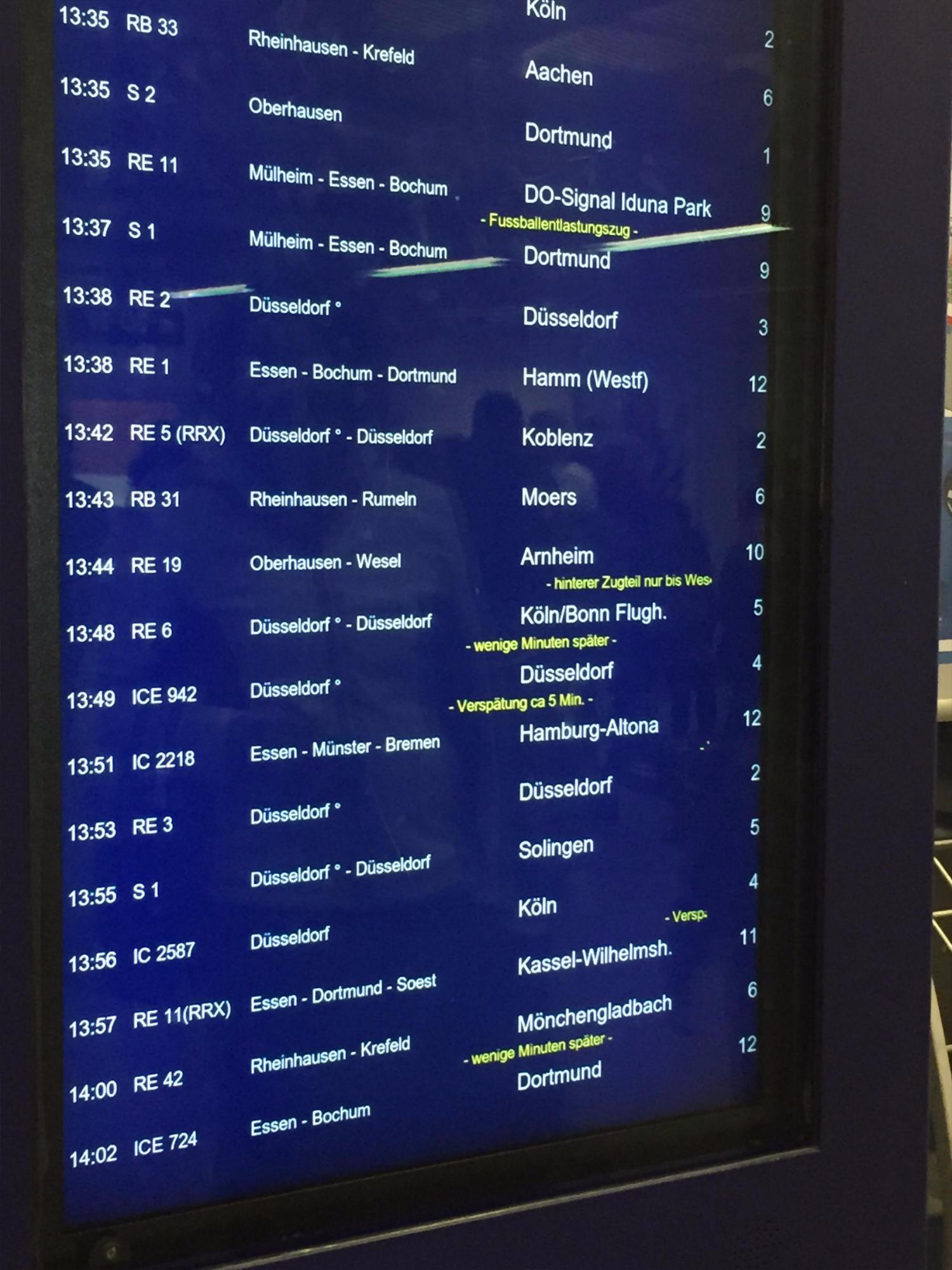 나는 공연을 보러 자주 이곳저곳을 다녔는데, 내가 사는 동독에서 서독의 루어트리엔날레까지 자그마치 기차로 8시간이상.이곳에서는 기차로 5시간은 그냥 보통시간이다. 2시간은 거의 애교. 연착하고 놓치고 갈아타는 거 예삿일이다. 그래서 드레스덴에서 베를린까지 버스로 2시간이 걸리는데, 자주 왔다갔다 했다. 아마 한국에서 부산에서 서울까지 가는것도 이제 아무렇지 않을 것 같다. 물론 동독에서 서독까지 가려면, 8시간 이상은 기본이다. 게다가 중간에 늘 기차는 연착을 하거나, 타는 곳이 바뀌거나 여착되거나 갈아타는 구간에 기차를 놓치는 경험도 자주 하게되고, 주말에 그런일이 발생하면 진짜 얄짤없다. 독일에서 살면서 익숙해져야 하는것이 바로, 기차 연착이나 주말에 기차가 사라지고 다른 기차로 대체되거나 승강장이 바뀌는 일이 있다는 것이다. 그래서 귀를 쫑긋! 독일어로 방송을 잘 듣고, 전광판도 잘 봐야 한다는 것. 수시로 타는 곳이 바뀔수도 있으니 말이다. (특히, 주말!, 에센이라는 도시는 주말에 교통편이 너무 안좋다. 자주 캔슬이 된다.)