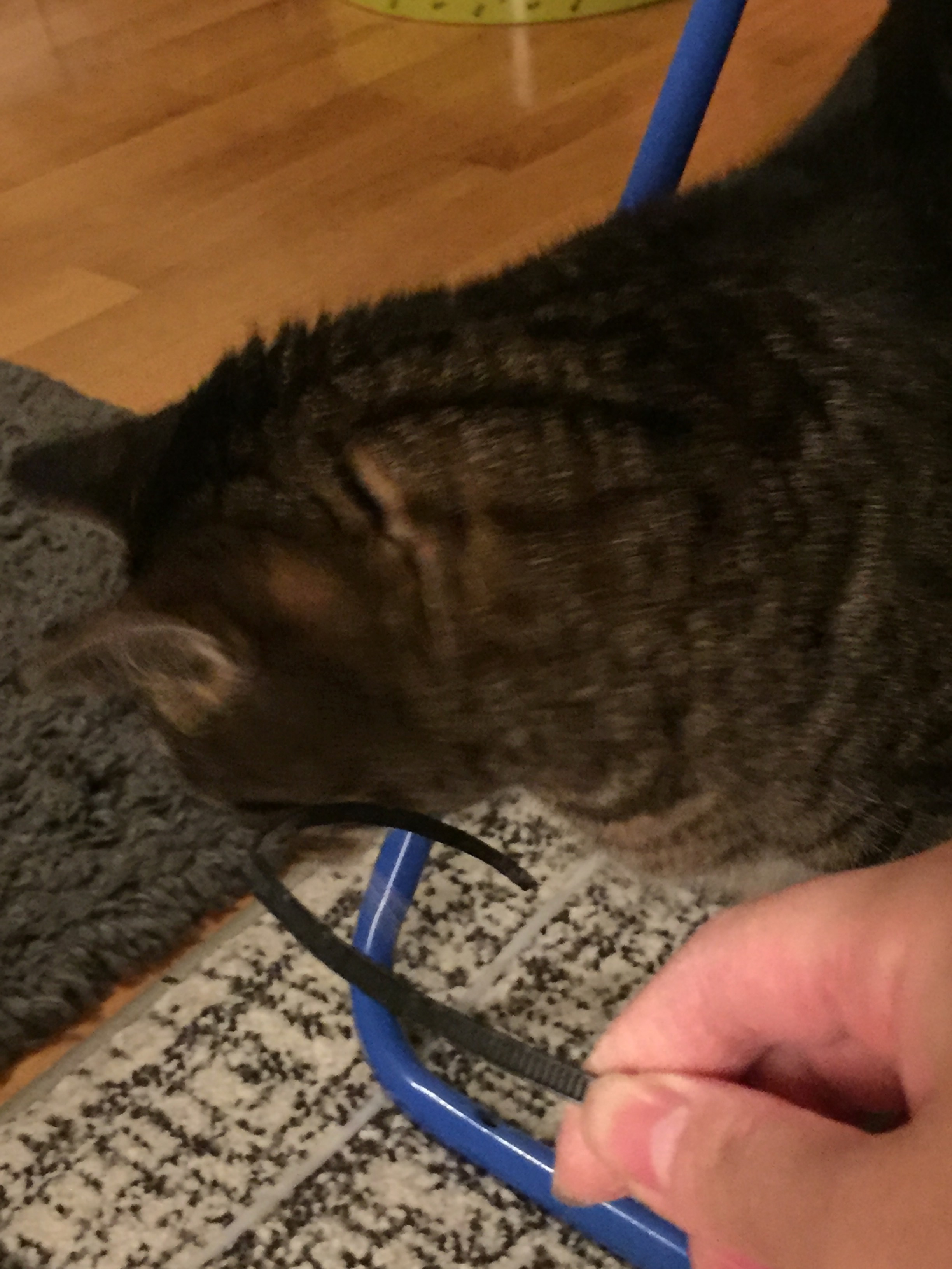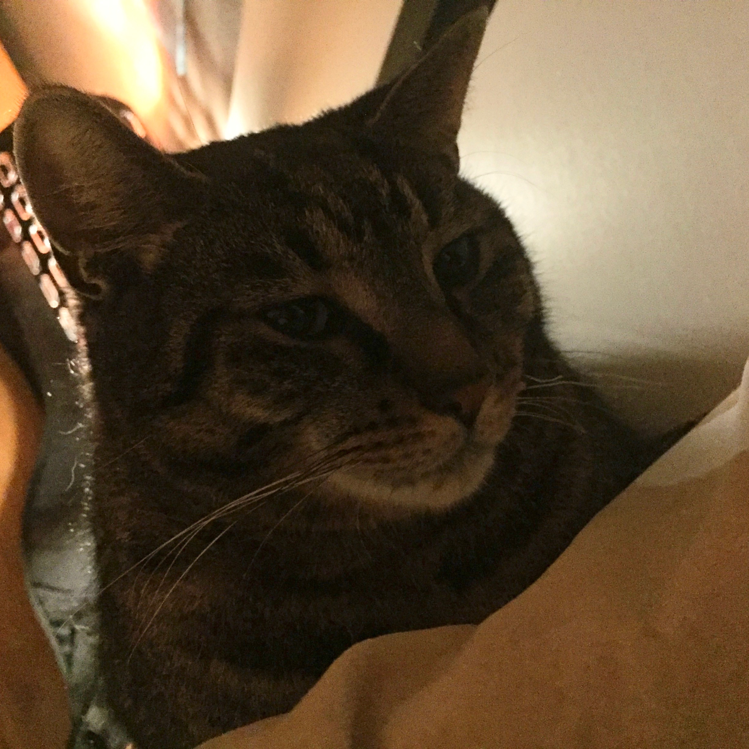 (집에 목줄이 있는데, 달려 있는게 많아서 불편할까봐 집에서는 목줄을 차지 않는다.)