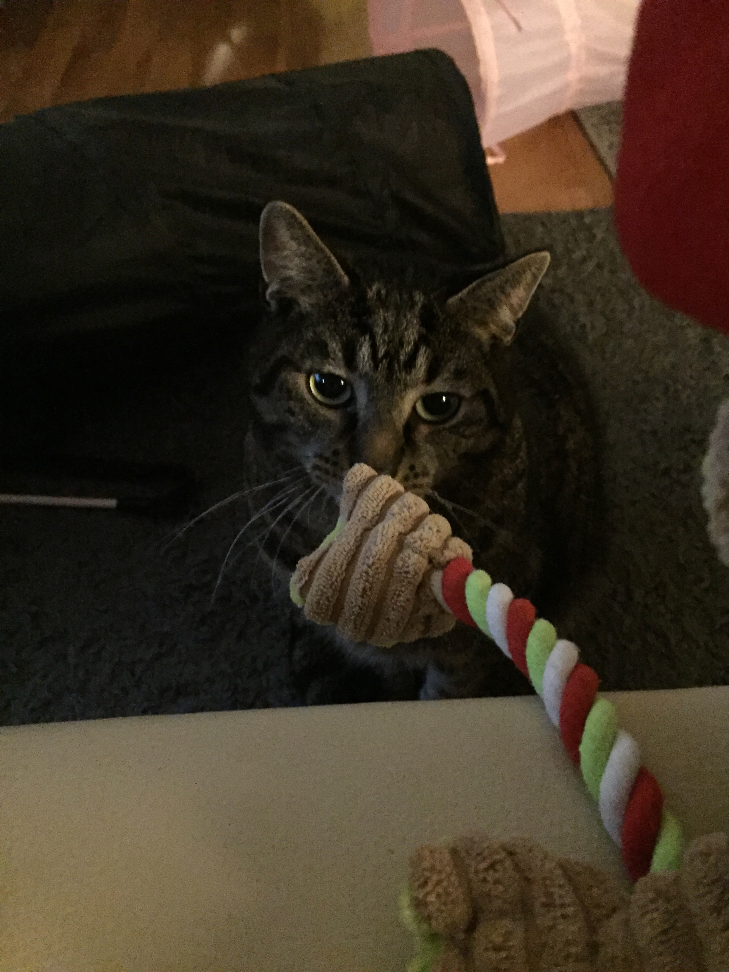 나랑 숨박꼴질 하거나, 전선같은거 노끈 혹은 그런 선들을 가지고 던지고 물어오고 막 그런걸 더 좋아하는 것 같다.