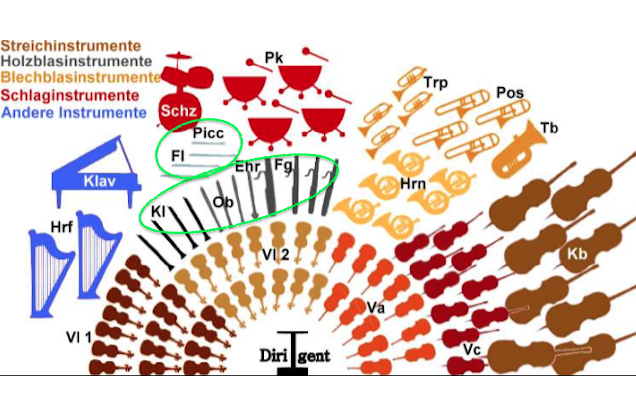 피아노는 일반적으로 <도>를 누르면, 도 소리가 난다. 그렇게 배웠으니까, 그런데 일반적으로 아니 기본적으로 악기의 모든 구멍을 막으면 <도>소리가 나야하는데, 시b소리가 나는 것이다. 그렇다. 바로, 장2도 아래의 소리가 나는 악기이다. 도를 운지하면 시b, 레를 운지하면 도, 하하 그래서 머릿속으로 계산을 해야한다. 내가 어떤 음을 연주하고 싶은지 말이다. 클라리넷은 우리가 오케스트라를 통해 악기를 구분지어 보았을 때, 목관악기에 속하는 악기이다. 오케스트라 위치를 보면 목관악기는 세컨바이올린 (제2바이올린) 뒤에 위치해 있다. 목관악기(Holzblasinstru-mente) 표시해놓은 연두색 뒤로 플룻과 피콜로는 소프라노와 그 이상의 높은 영역을 노래하는 파트의 악기이다. 위치가 달라지기도 하는데, 그것은 작곡가나 지휘자에따라 달라질수도 있다.