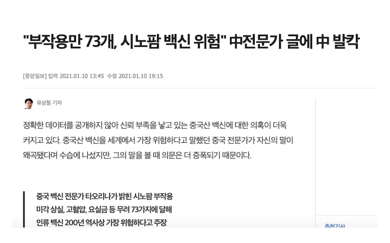 그런데, 효과가 있다는 쪽도 있고(현재, 대한민국)...부작용만 73개라는 최신기사.....말이 너무 극단적으로 달라도 너무 다르다. 그런데 바로, 중국 전문가 글 때문에 탄로가 났다.