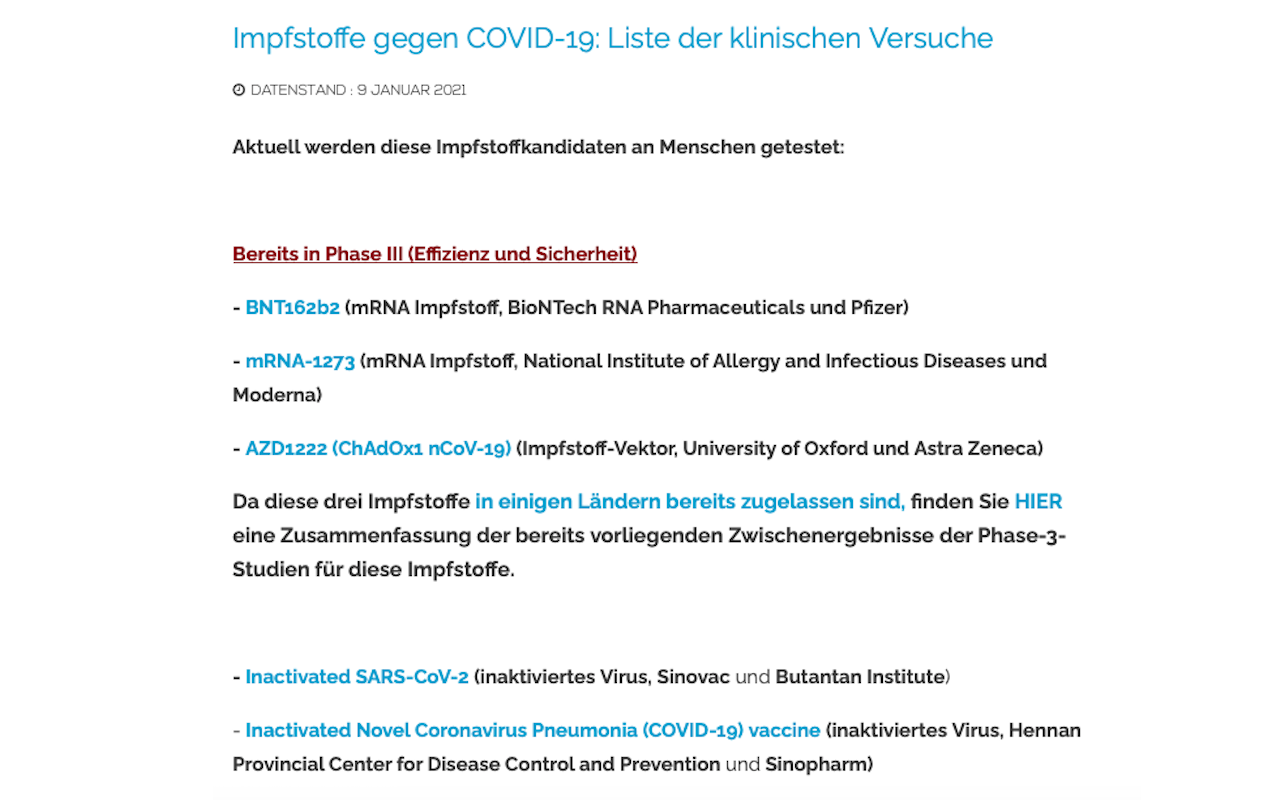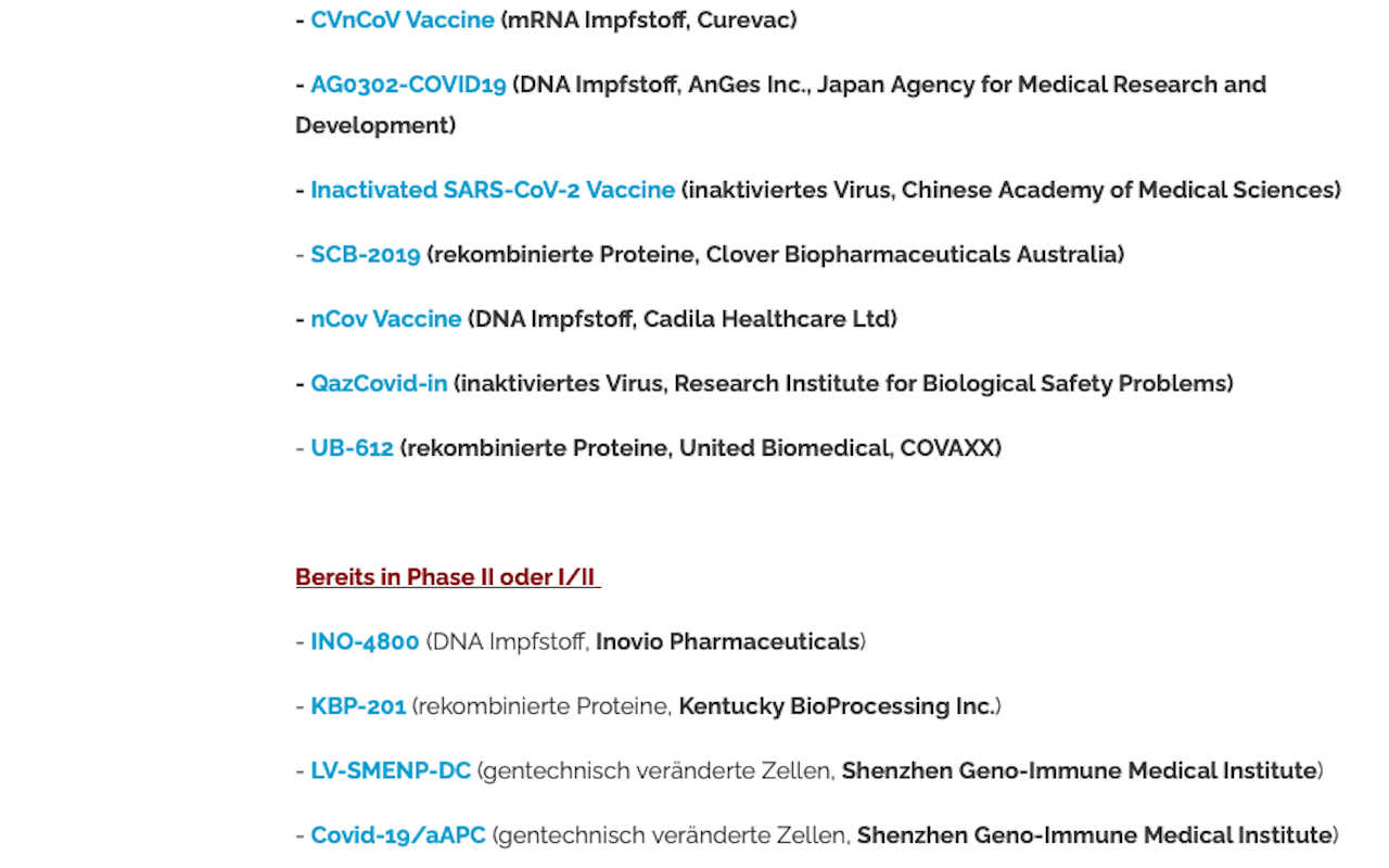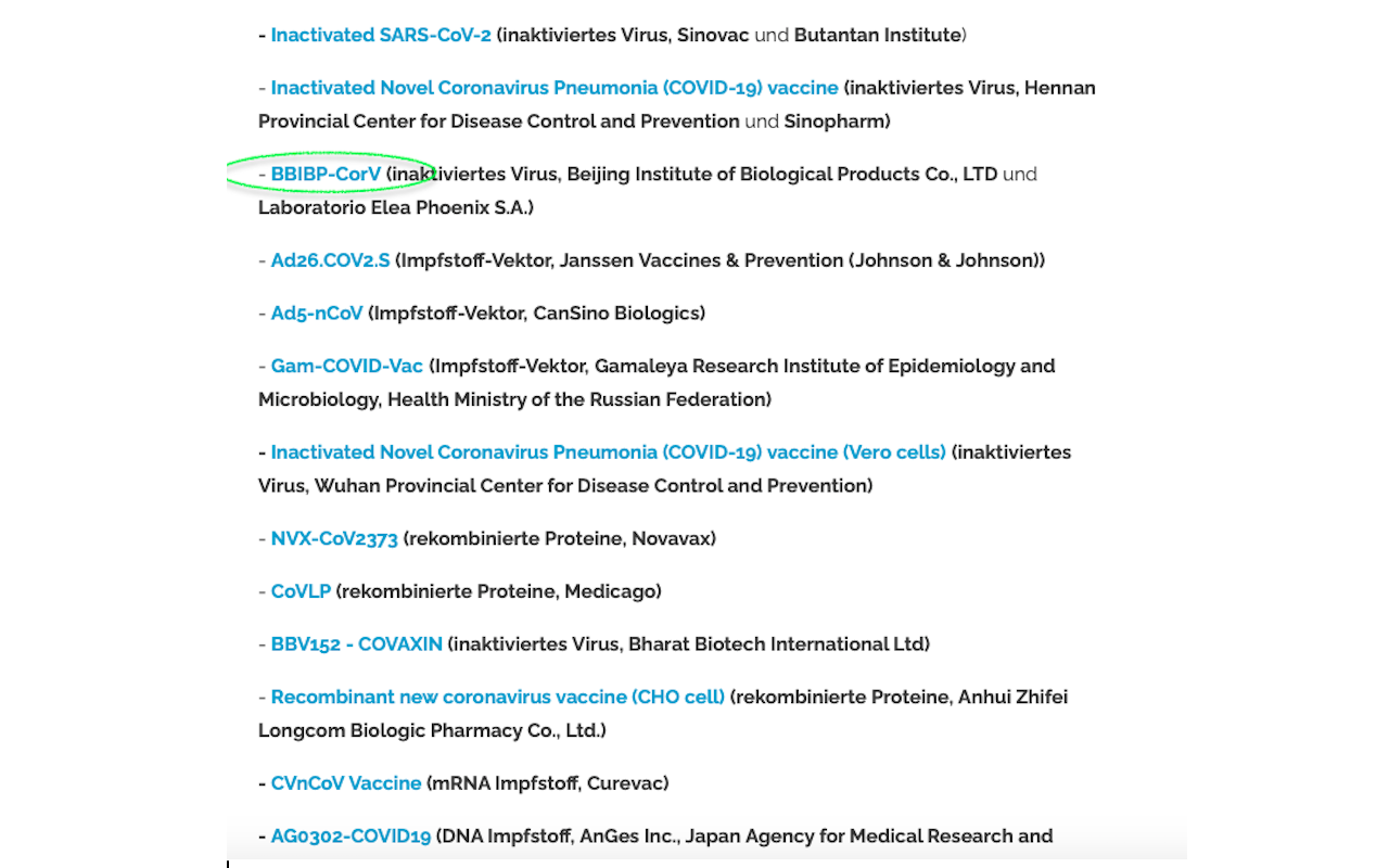 현재 독일 병원들이 어떤 백신을 사람들에게 테스트하고 있는지 알려주고 있다. 백신들중에 중국의 시노팜 백신 <BBIBP-CorV>도 들어가 있다.
