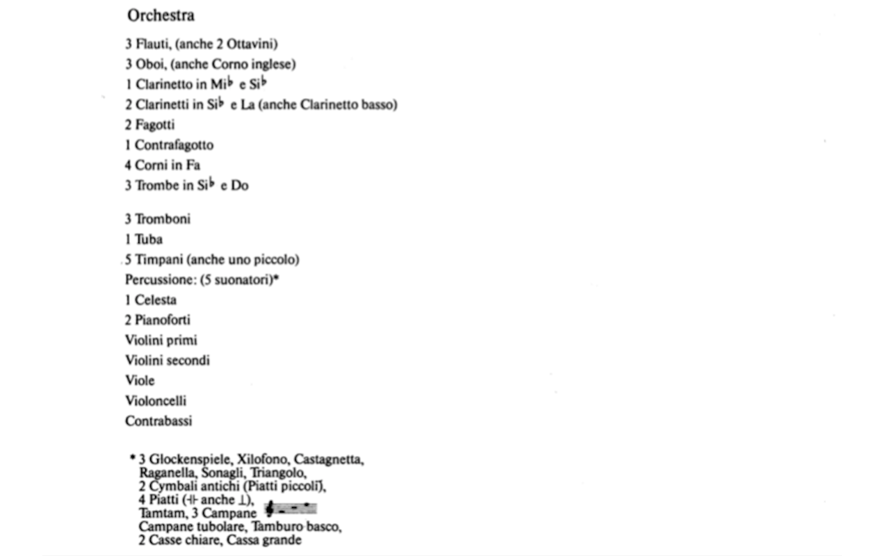 3 플룻, 3 오보에, 1 Eb 혹은 Sib클라리넷, 2 클라리넷, 2 파곳, 4대 호른, 3대 트럼본 (Sib, Do), 3파트 트럼본, 튜바...etc.