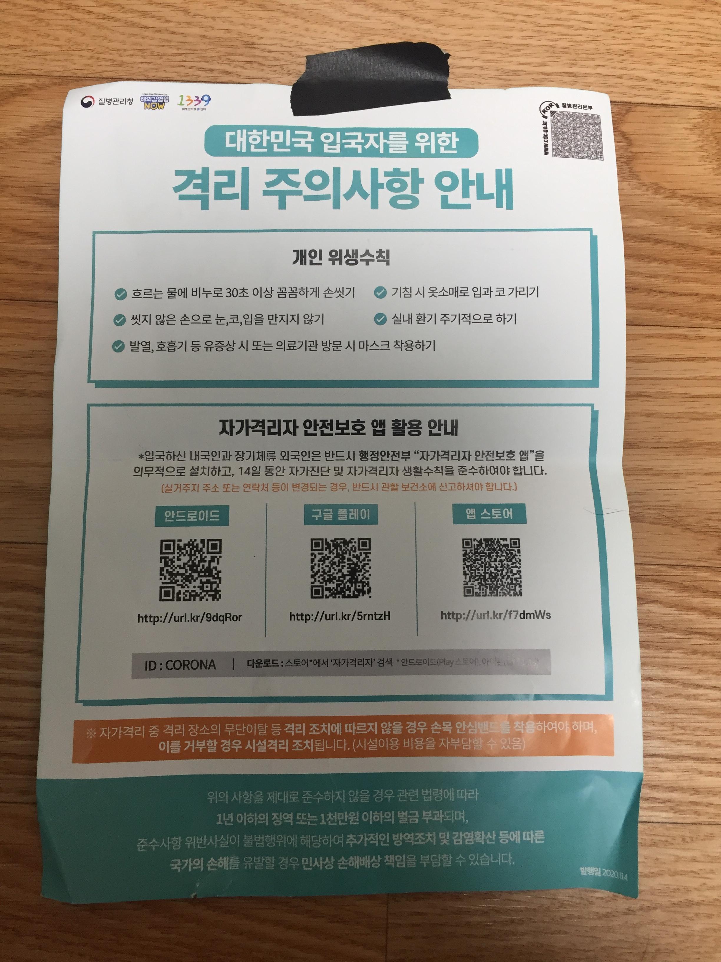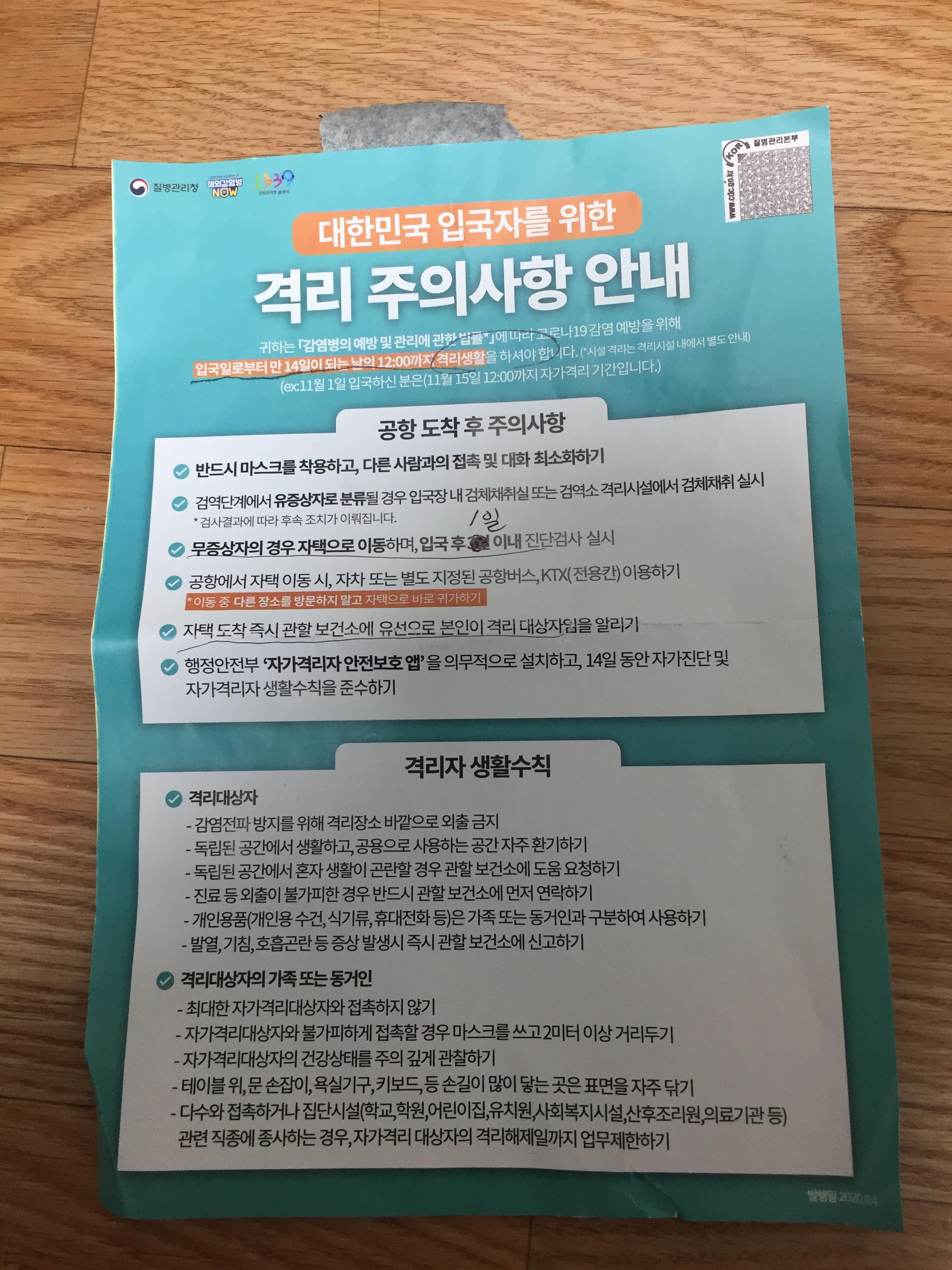일단, 입국과정에서 유의물을 여러개 나눠준다. 그 유의물에 자가격리에 대한 유의사항이 적혀있다.