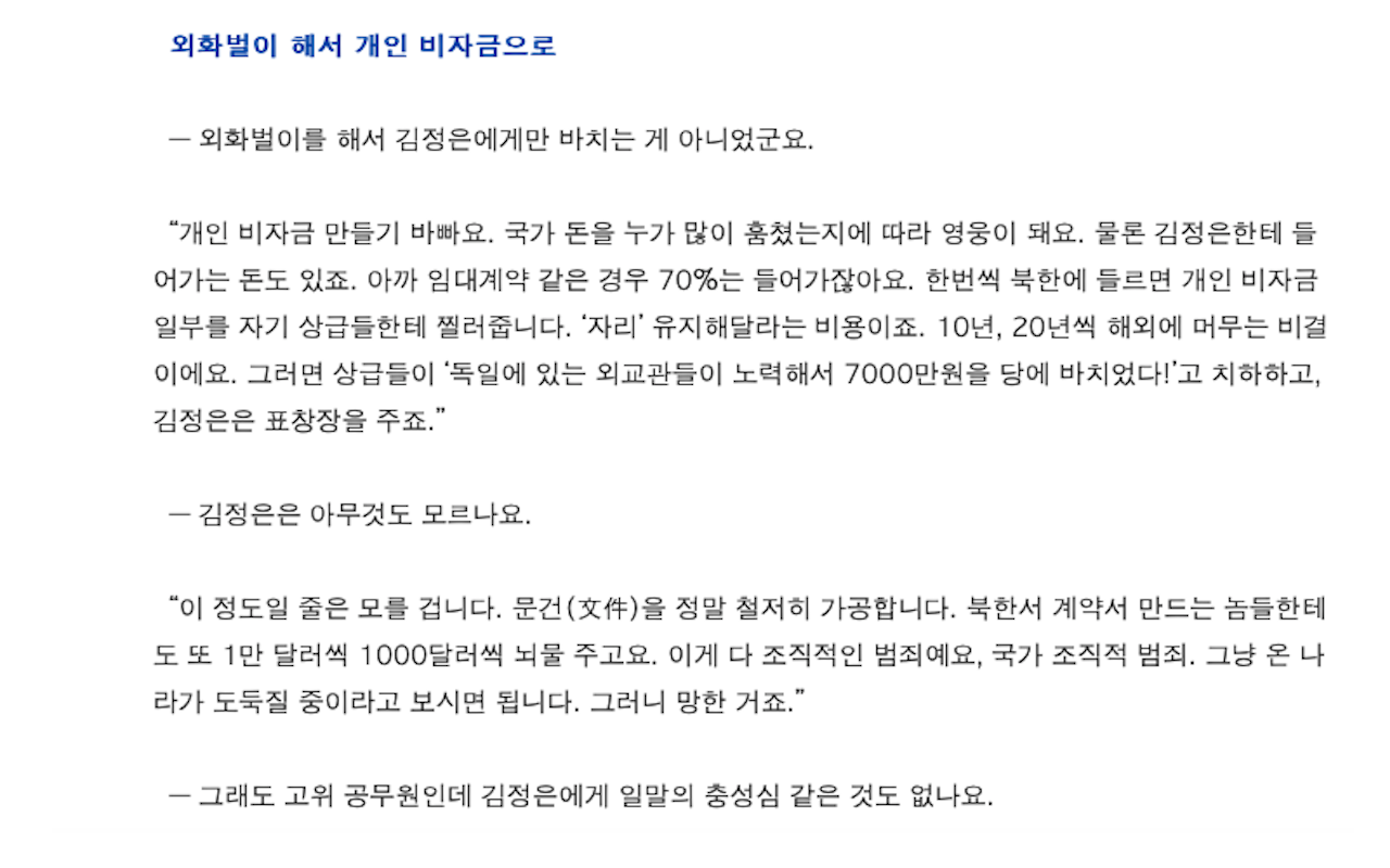 영화 베를린에서도 나오지만, 영화 속에서 이경영이 북한에 보내야 할 자금 일부를 빼돌렸다는 얘기가 나온다. 그런데, 실제로는 조금 다른 방향성의 얘기가 실제로 나온다. 북한 공작원들이 해외에서 노동후에 벌어들이는 돈을 개인 비자금을 해서 만들기 바쁘다는 얘기다. 꽤 신선하다.