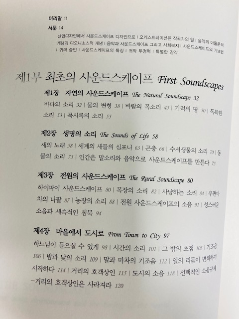 목차가 4개로 나뉜다. 1부 최초의 사운드 스케이프, 2부 산업화 이후의 사운드 스케이프, 3부 분석 , 4부 사운드스케이프 디자인을 향하여.